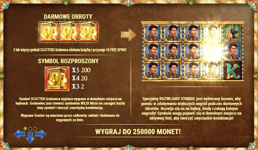 - W liczbie 3 na planszy uruchamia rundę 10 darmowych spinów.