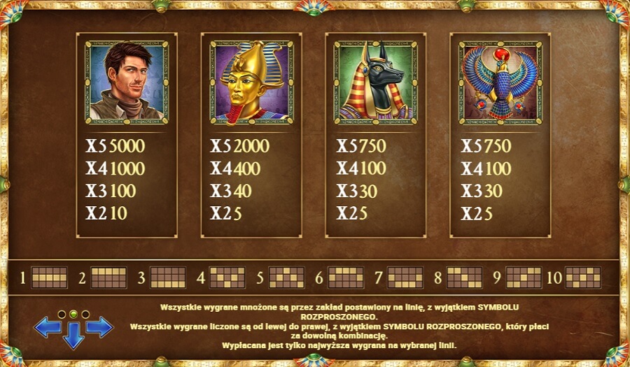 Sprawdzenie wartości wygranych jest nieodłącznym elementem przed rozpoczęciem rozgrywki. W Book of Dead znajdziesz te informacje w dolnym prawym rogu strony, rozwijając zakładkę “Tabela Wypłat”. Niektóre symbole przynoszą nam wygraną już od 2 takich samych na linii, pozostałe — od trzech do pięciu. Zobaczmy, jak Play’n Go ustawiło zasady i wartości symboli na przykładzie tabeli.